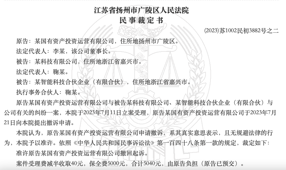 裁判文书网信息显示,该案件于2023年7月11日由扬州市广陵区人民法院立案受理,同月21日原告广陵国投提出撤诉。2024年6月,广陵国投退出光彩芯辰股东行列,当时持股比例约4.71%。