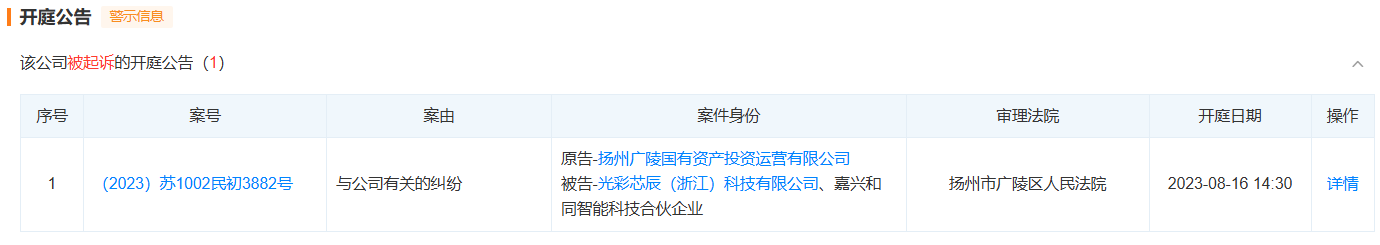 记者注意到,天眼查APP显示,光彩芯辰及主要股东嘉兴和同曾在2023年涉及一起与扬州广陵国有资产投资运营有限公司(以下简称“广陵国投”)的民事纠纷。