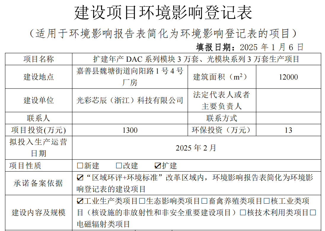 当前,光彩芯辰也在加紧扩产能。据嘉善县人民政府官网,2025 年 1 月 10 日,一则嘉兴市生态环境局“区域环评+环境标准”降级管理项目公告显示,光彩芯辰存在“扩建年产 DAC 系列模块 3 万套、光模块系列 3 万套生产项目” 环评文件。可以看出,该项目投资1300万元,环保投资13万元,拟投入生产运营日期为2025年2月份。