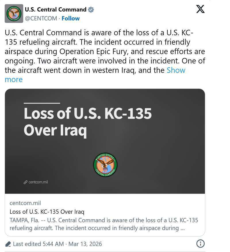 “中央司令部获悉一架KC-135加油机损失。”13日早晨,美军中央司令部通过社交媒体发布消息称,“这起事件发生在‘史诗狂怒’行动期间的友军领空,救援工作仍在进行。事故涉及两架飞机,其中一架飞机在伊拉克西部坠毁,另一架安全着陆。”